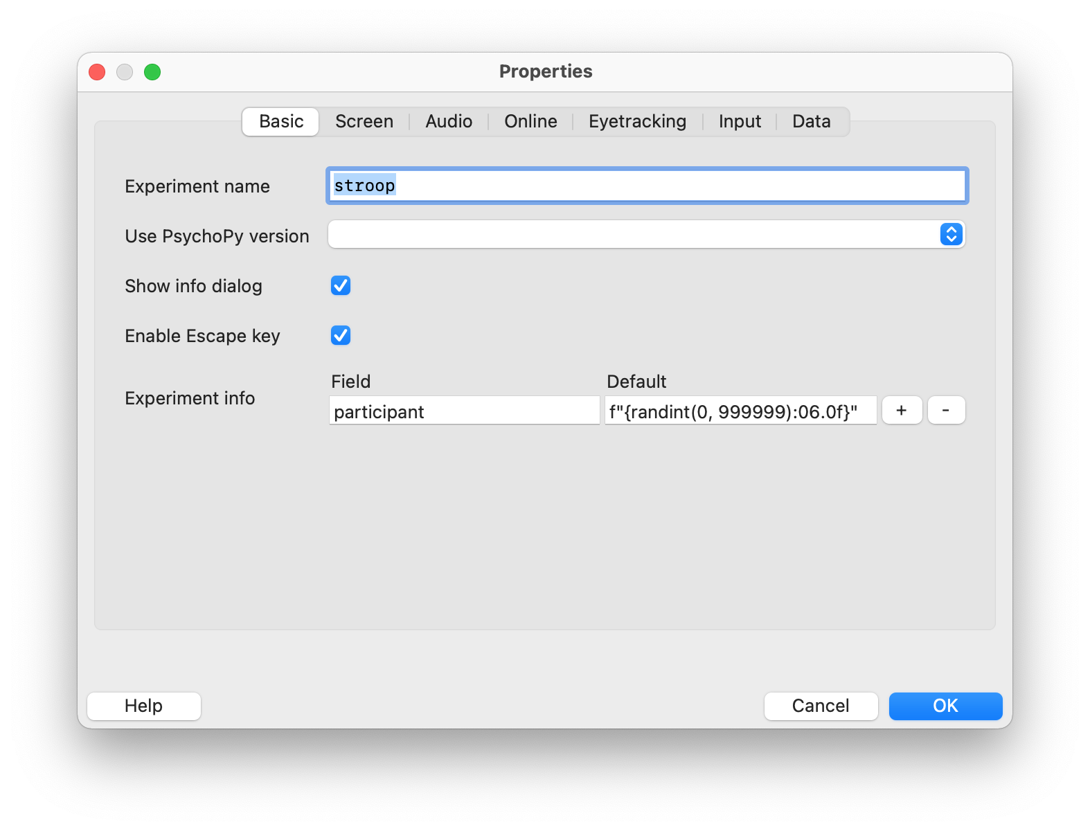 First, we define some basic properties in the “Experiment Settings”. By clicking the gear icon, we open a dialog where various settings can be adjusted. For our example, we change the experiment name to “stroop” and delete the second line in the “Experiment info” section by clicking the minus symbol at the far right of that line. This ensures that PsychoPy only prompts for the participant’s name (“participant”) before running the experiment.