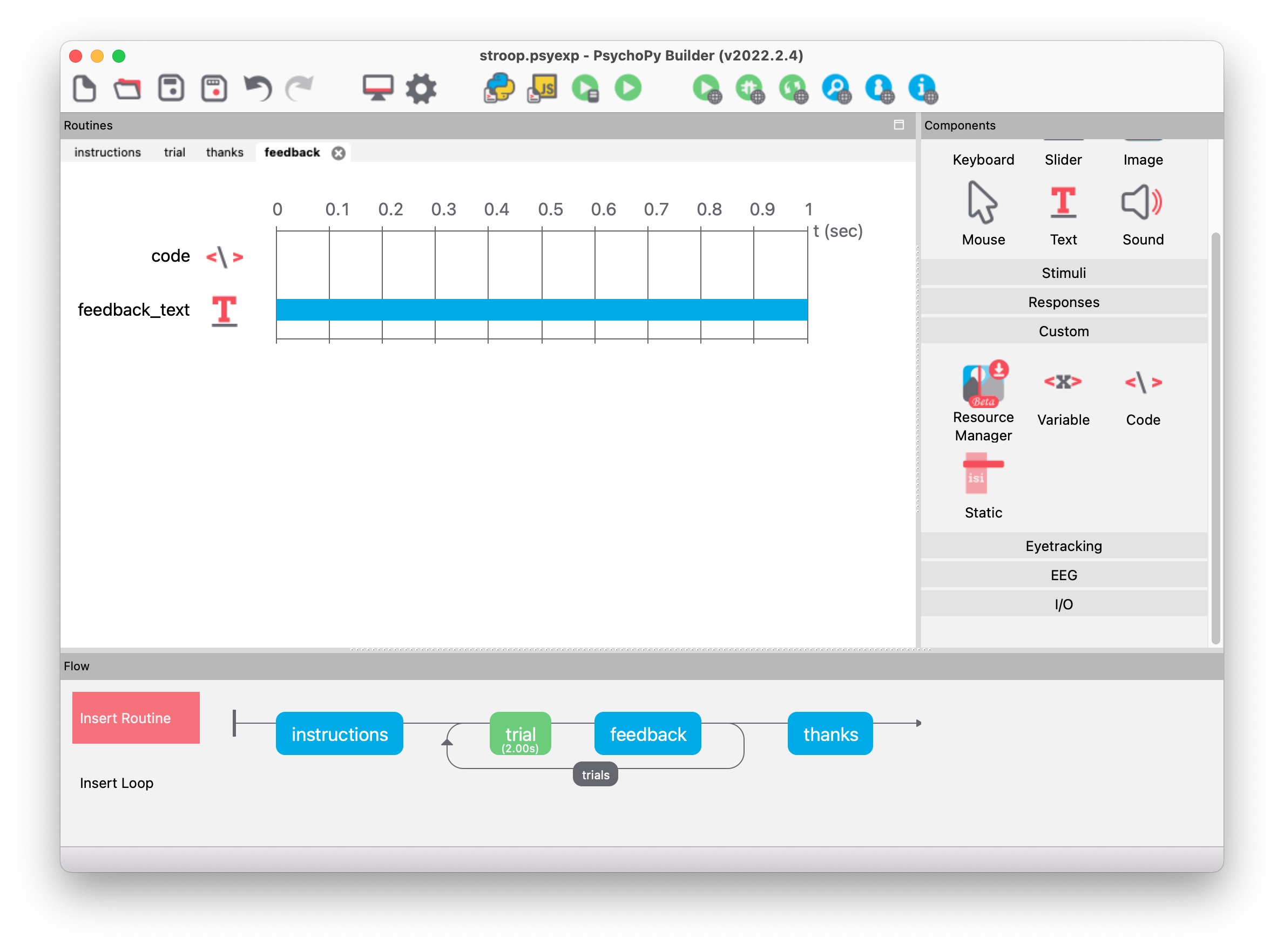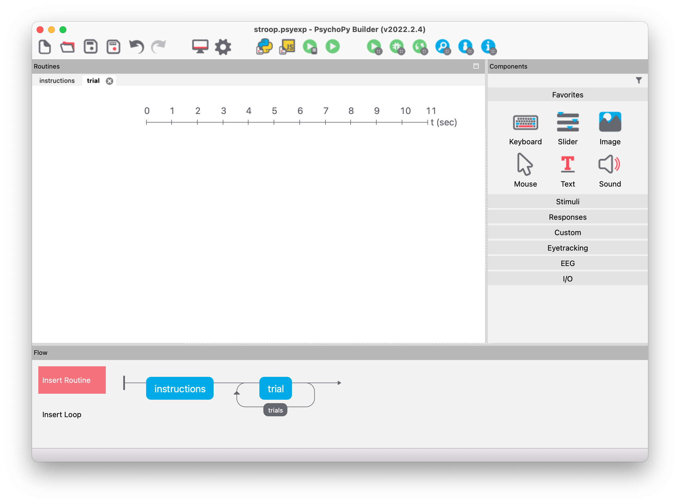 Routines are the basic building blocks of an experiment. They are shown in the main area of the Builder window (“Routines”) with a timeline. If multiple routines are present in the experiment, they are visualized in separate tabs. The timeline enables us to see when specific components are active in a routine.