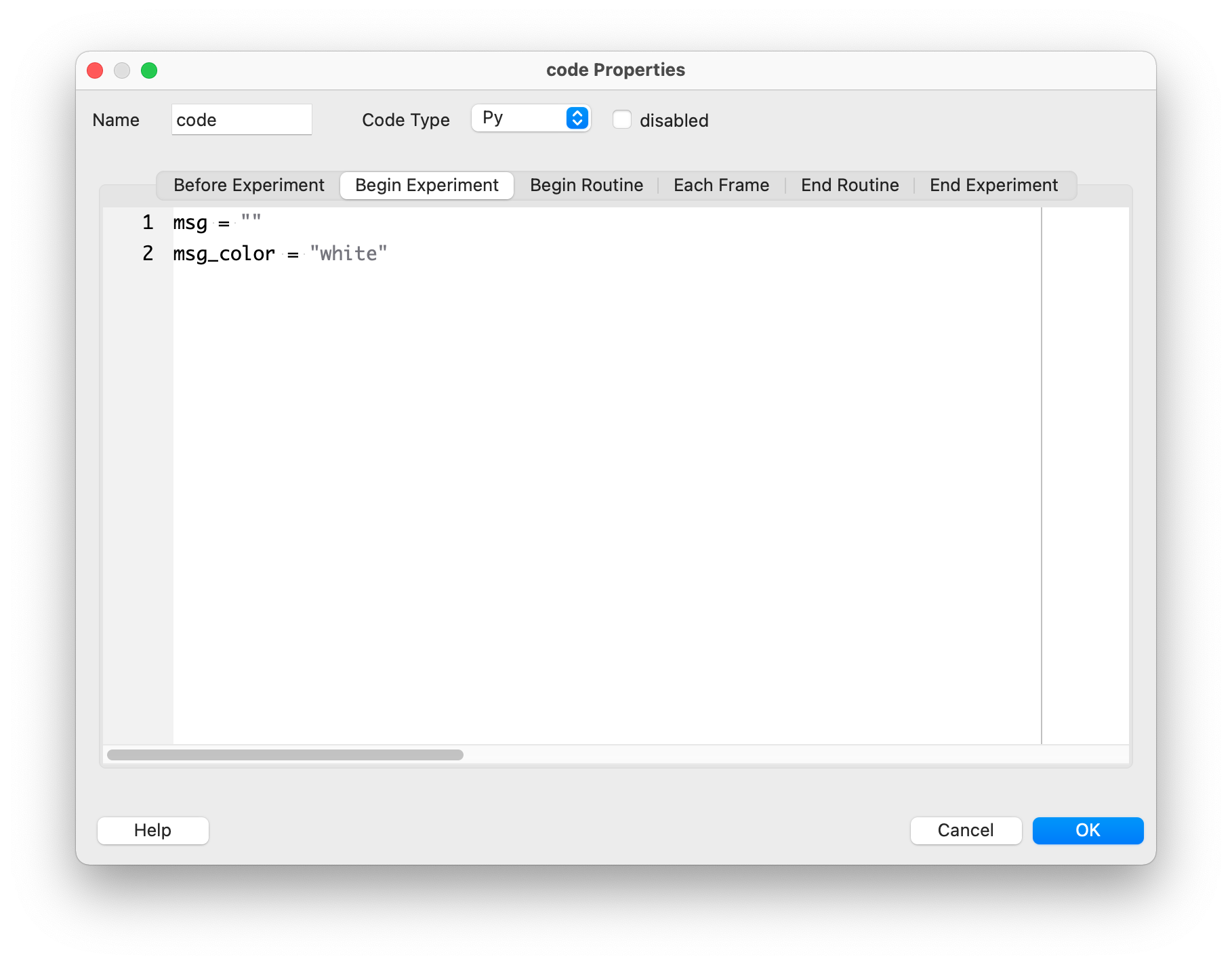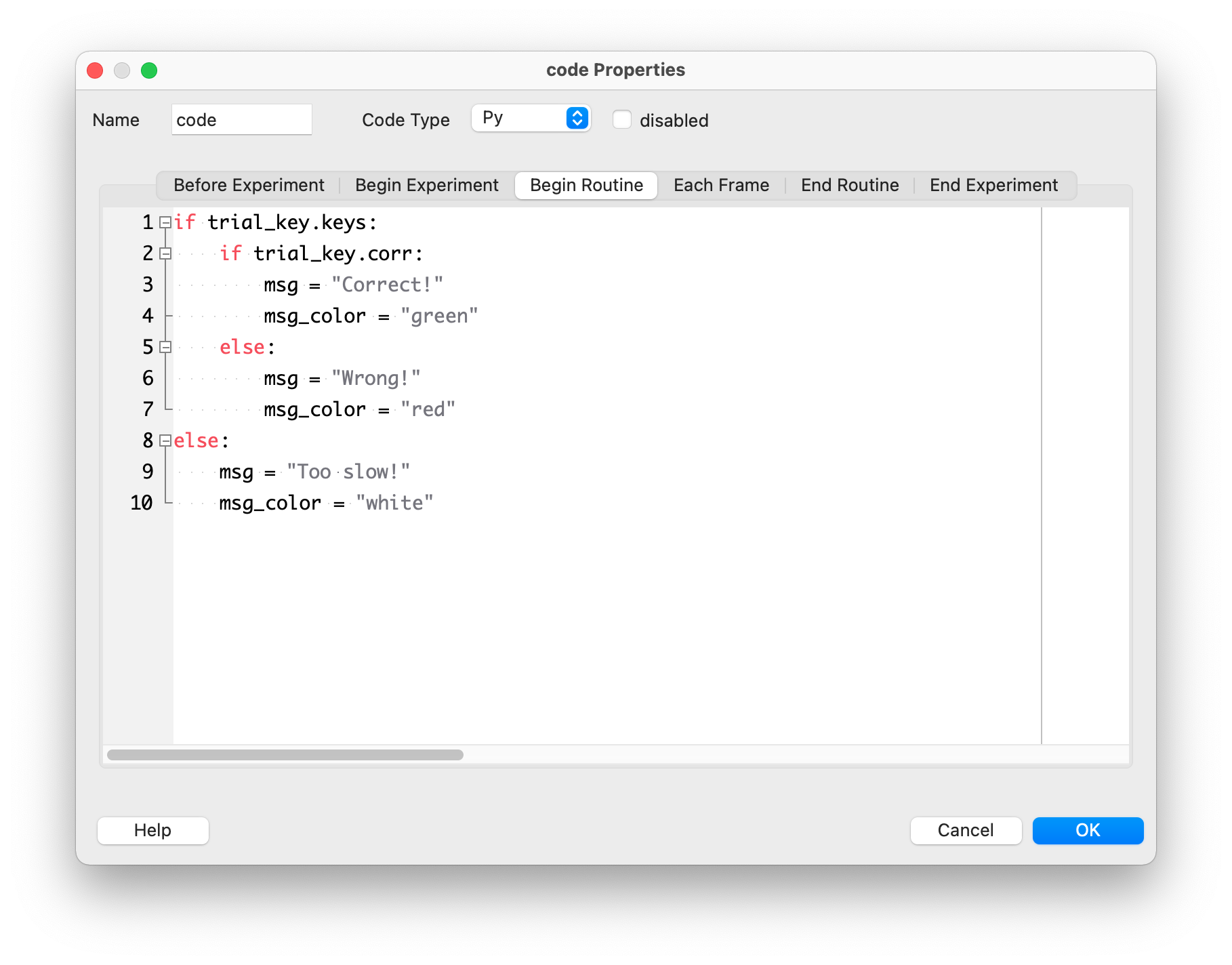 It is important to initialize all Python objects with default values at the beginning of the experiment. To do this, we add the following code in the “Begin Experiment” section: