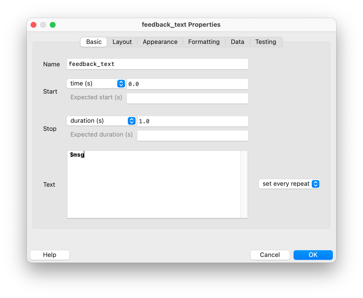 To provide feedback after each trial, we add a new routine named feedback directly after the trial routine. It is important that this routine is still within the loop, as we want to give feedback after each trial. Since we want to display a text, we add a text stimulus named feedback_text. Because we cannot display a fixed text, we use the names $msg for the text and $msg_color (in the “Appearance” tab) for the text color (both fields must be set to “set every repeat”). These two Python objects should contain the text (“Correct!”, “Wrong!”, or “Too slow!”) and the corresponding colors (green, red, or white) – we will implement this in the next step.