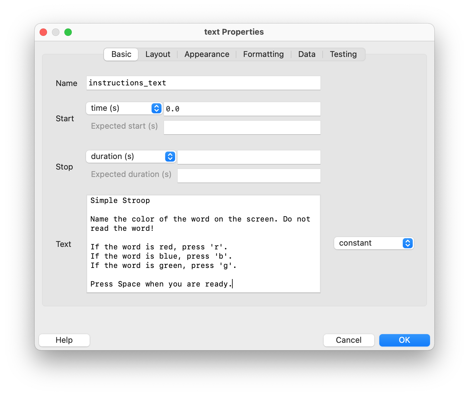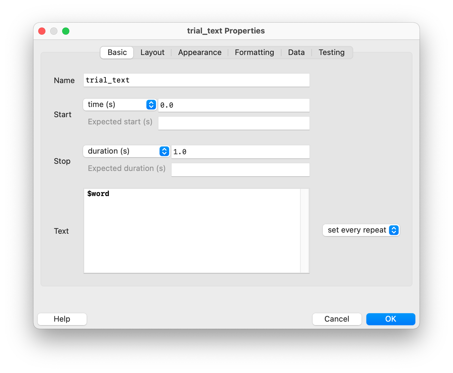 Now we need to fill the routine “trial” with the necessary components. We want to display each word for one second, so we add a text stimulus and set its properties as follows:
