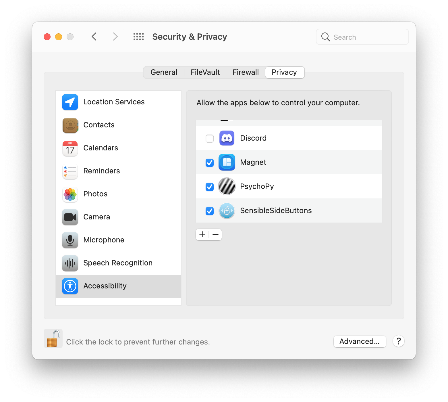 On macOS, we need to allow PsychoPy to control the computer (otherwise the experiments will not work). This can be done in the system settings under “Security & Privacy” by clicking on “Accessibility” and then on “PsychoPy” (click on the lock icon and enter the administrator password).