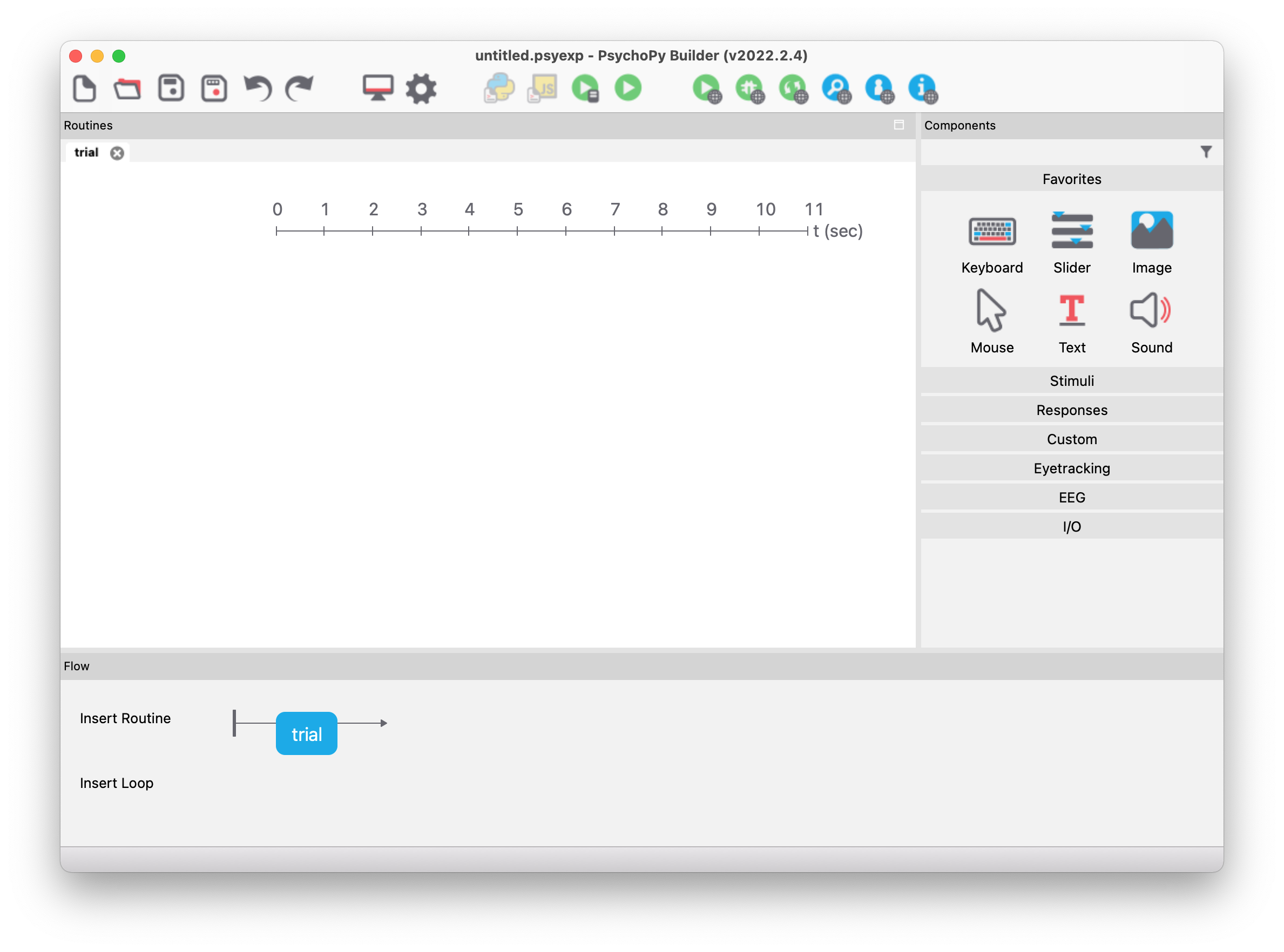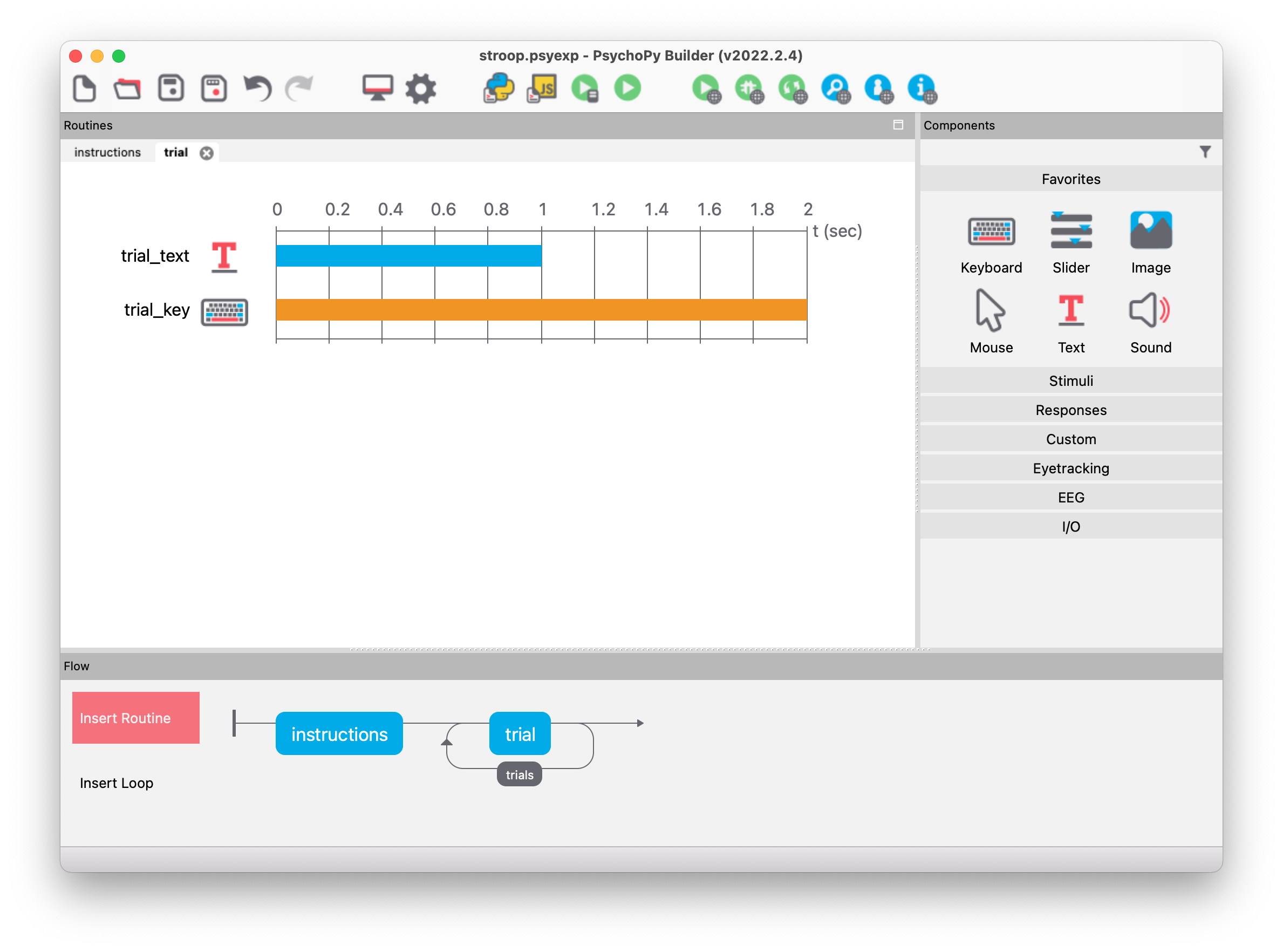 The lower area (“Flow”) provides an overview of the entire experiment, which consists of routines and loops. Currently, the experiment consists of only one routine named “trial” (shown as a blue box).