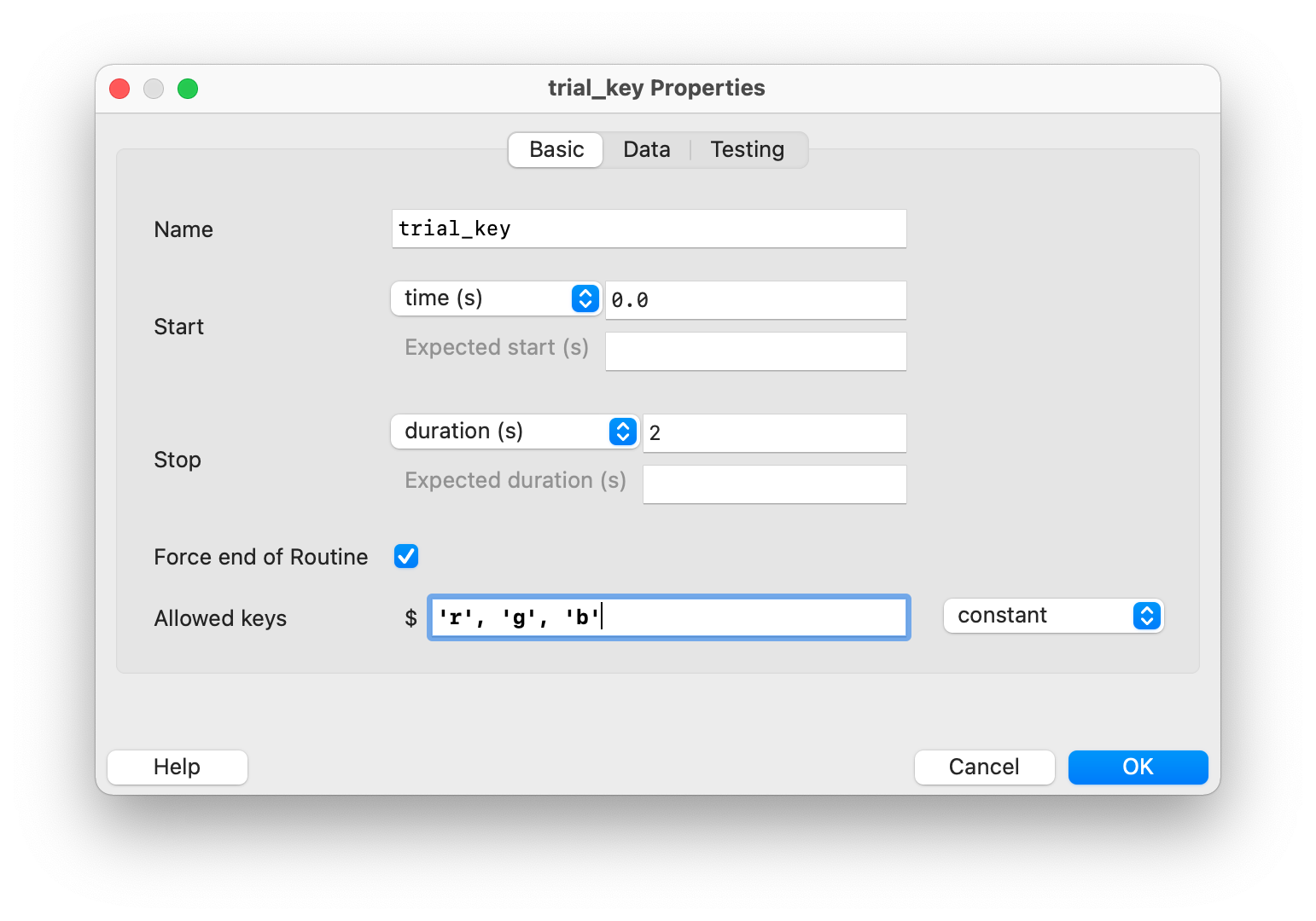 Participants have 2 seconds to press one of the three keys r, g, or b to indicate the color of the word. The routine ends either directly after they press a key or after 2 seconds. We also want to store whether the answer is correct or not – this is achieved with the column correct (from the Excel file), which contains the expected correct key presses. This way, the expected answer can be compared with the actual answer. The result of this comparison is then automatically saved in the result files. We should also store the first key press (“first key”), as this is relevant for the answer.