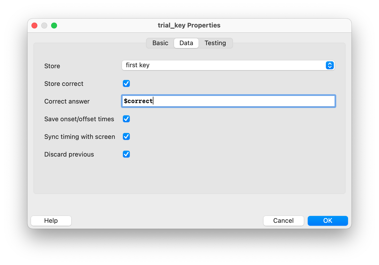 trial_key.keysis a list containing the key(s) pressed in the current trial. If no key has been pressed, this list is empty.trial_key.corris aboolvalue (i.e.,TrueorFalse) indicating whether the pressed key was correct or incorrect.