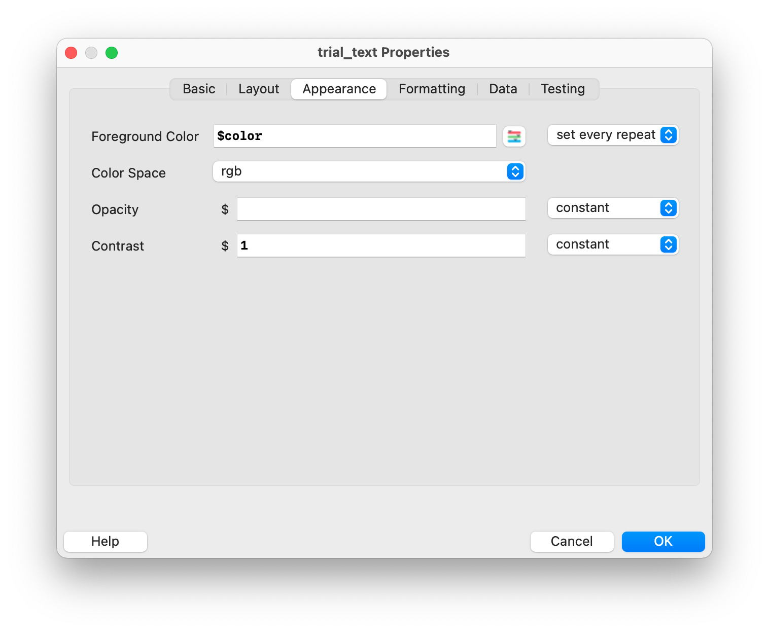 The trick here is to use variable names by prefixing them with a dollar sign. The text to be displayed is therefore not constant, but determined by the content of the variable $word. It is important that “set every repeat” is selected so that the content of the text is updated with each loop iteration. We can use all column names from the file conditions.xlsx as variables, so $word refers to the first column called word.
