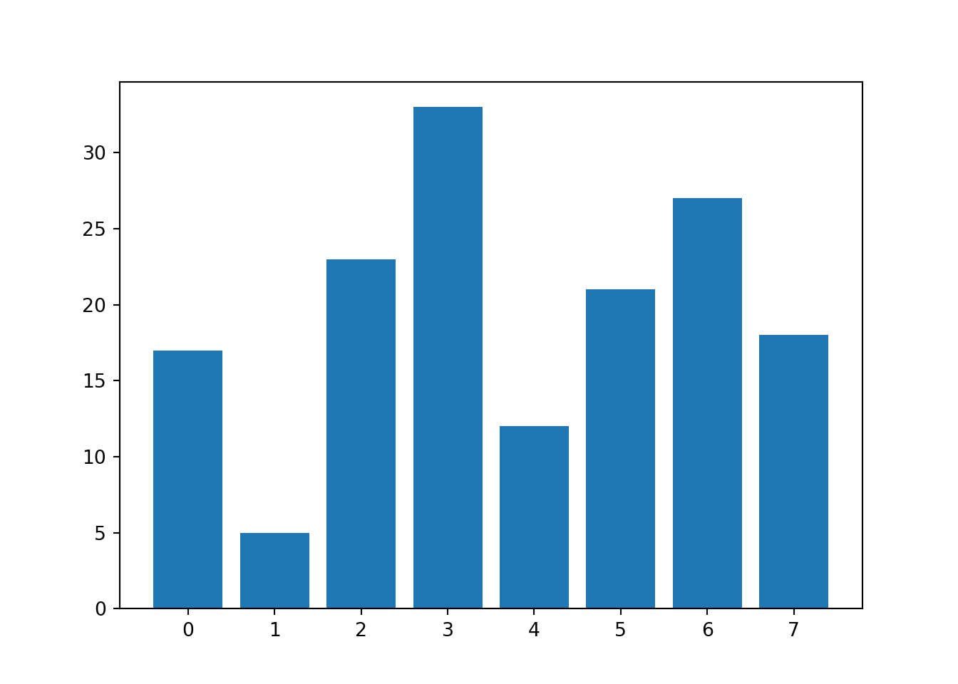 y = [17, 5, 23, 33, 12, 21, 27, 18]We can then display these values with the bar method: