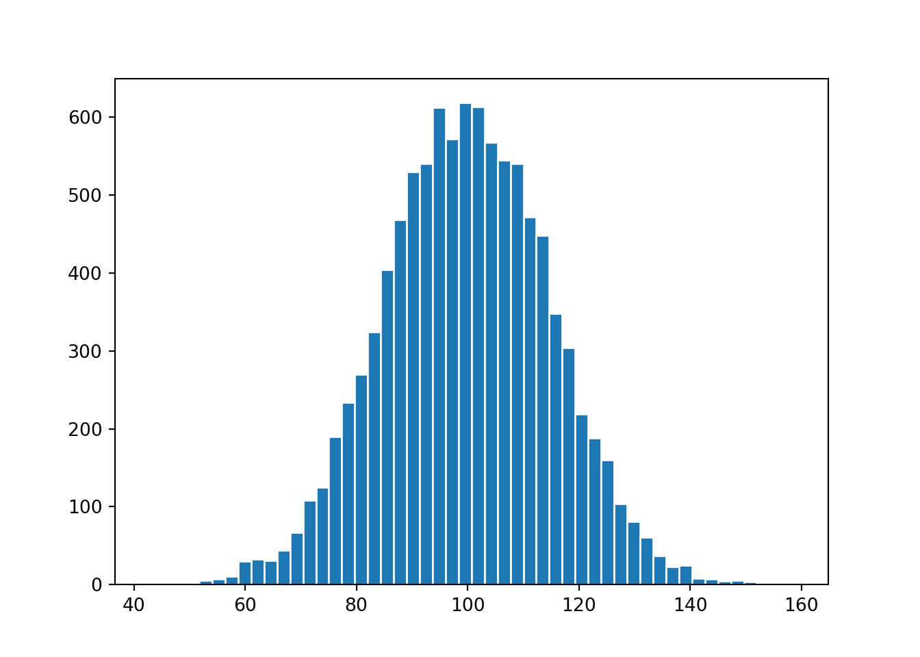 x = rng.normal(loc=100, scale=15, size=10000)We can now display the distribution of x as a histogram: