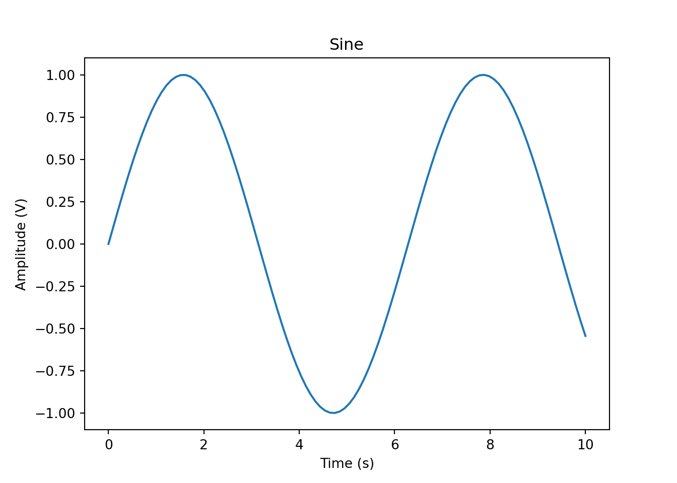 ax.set(title="Sine", xlabel="Time (s)", ylabel="Amplitude (V)")