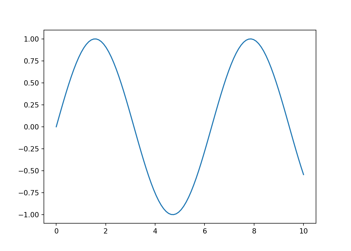 y = np.sin(x)To create a line plot, we call the plot method and pass the data for the x- and y-axes: