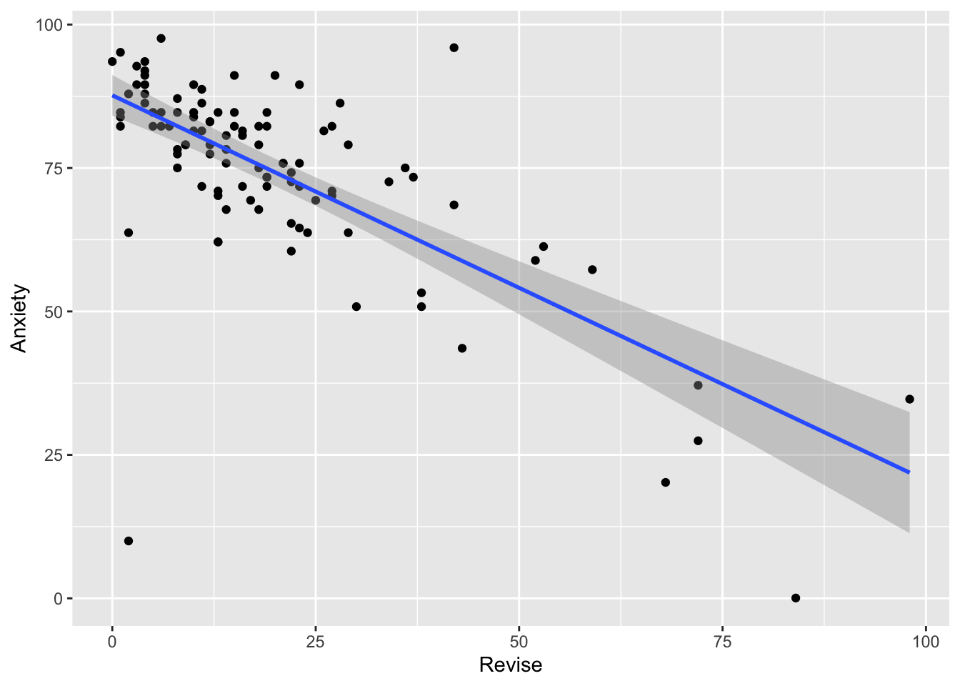 cor(exam[, c("Exam", "Anxiety", "Revise")]) Exam Anxiety Revise