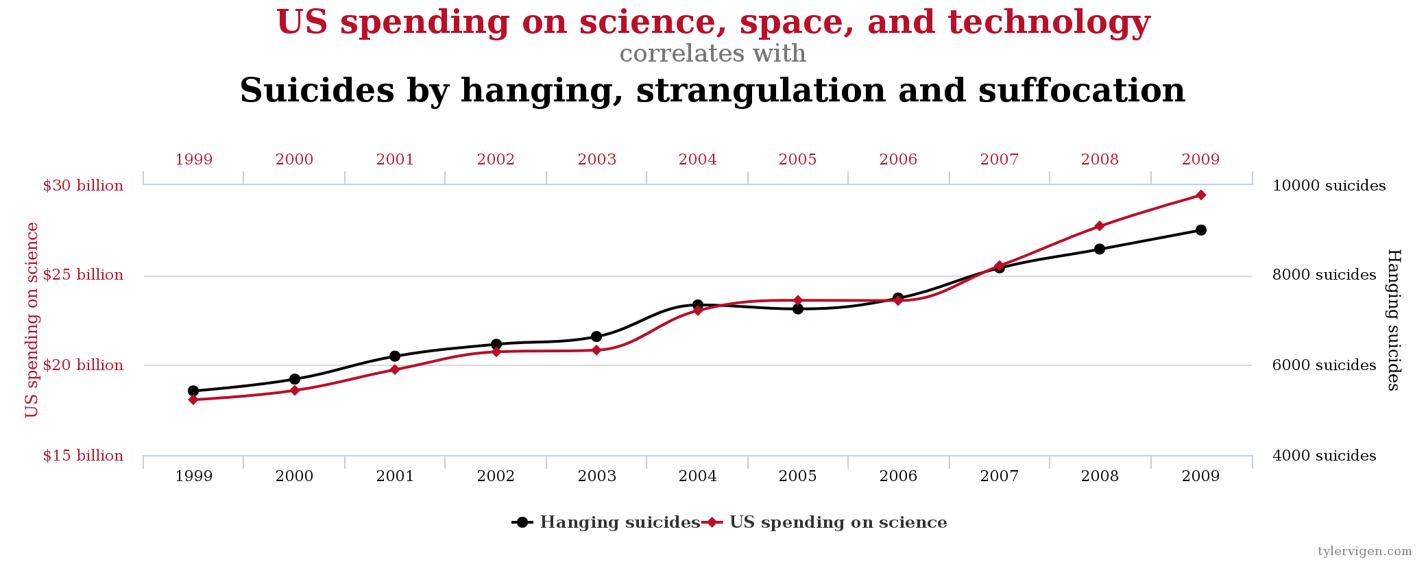 Folgende Beispiele von der Website Spurious Correlations illustrieren die Gefahr der fehlerhaften Interpretation von Korrelationen. Im ersten Beispiel werden die Ausgaben für den Bereich Wissenschaft, Raumfahrt und Technik der USA im Zeitraum 1999–2009 dargestellt. Gleichzeitig werden die Anzahl der Selbstmorde durch Hängen, Strangulieren und Erstickung im selben Zeitraum gezeigt. Man sieht, dass beide Kurven einen sehr ähnlichen Verlauf haben, und der Korrelationskoeffizient (dazu später mehr) ist mit \(r=0.998\) extrem hoch: