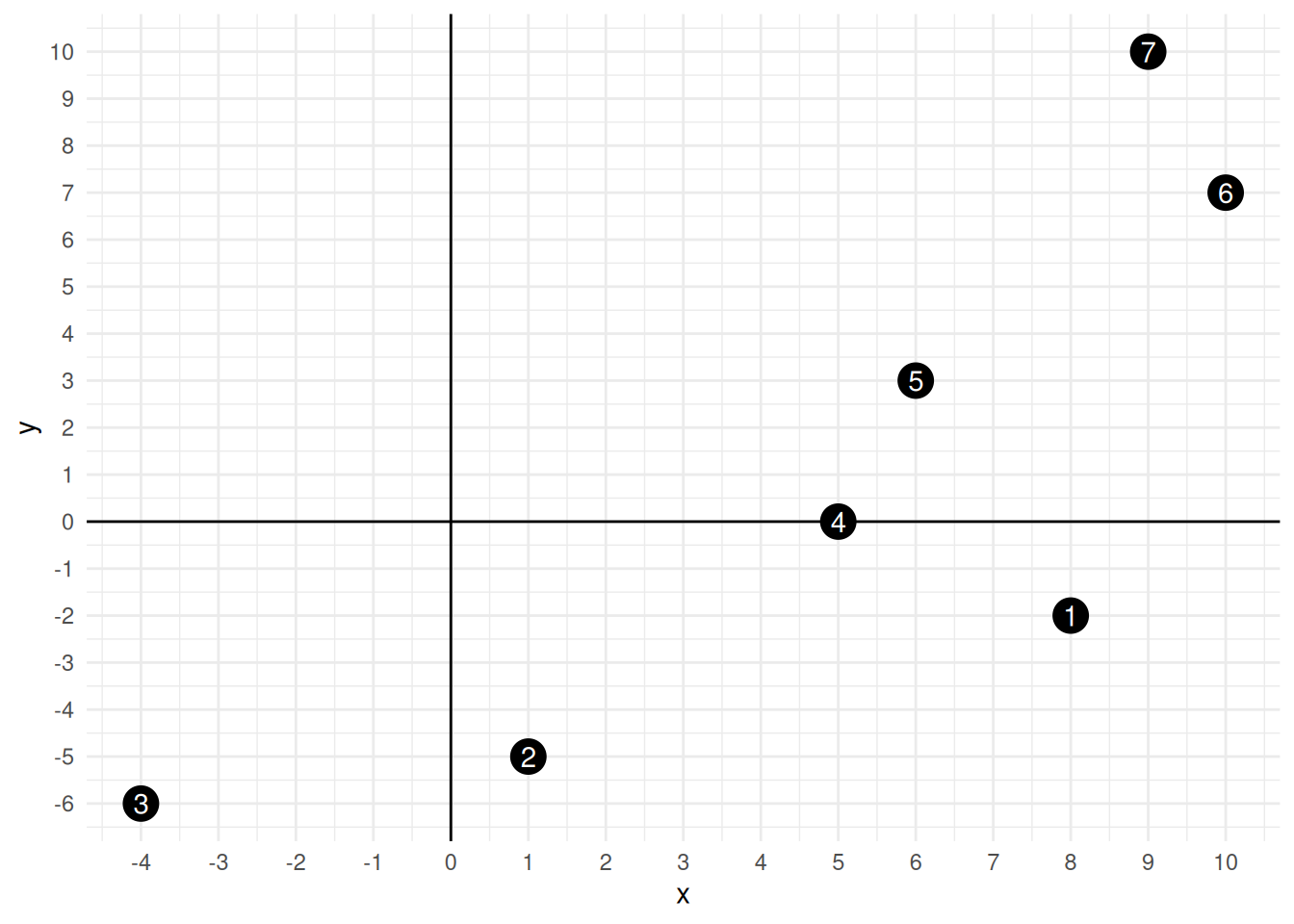 \[ \begin{aligned} x &= (8, 1, -4, 5, 6, 10, 9) \\ y &= (-2, -5, -6, 0, 3, 7, 10) \end{aligned} \]