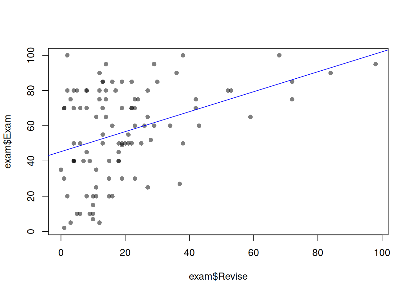 abline(lm(exam$Exam ~ exam$Revise), col="blue")