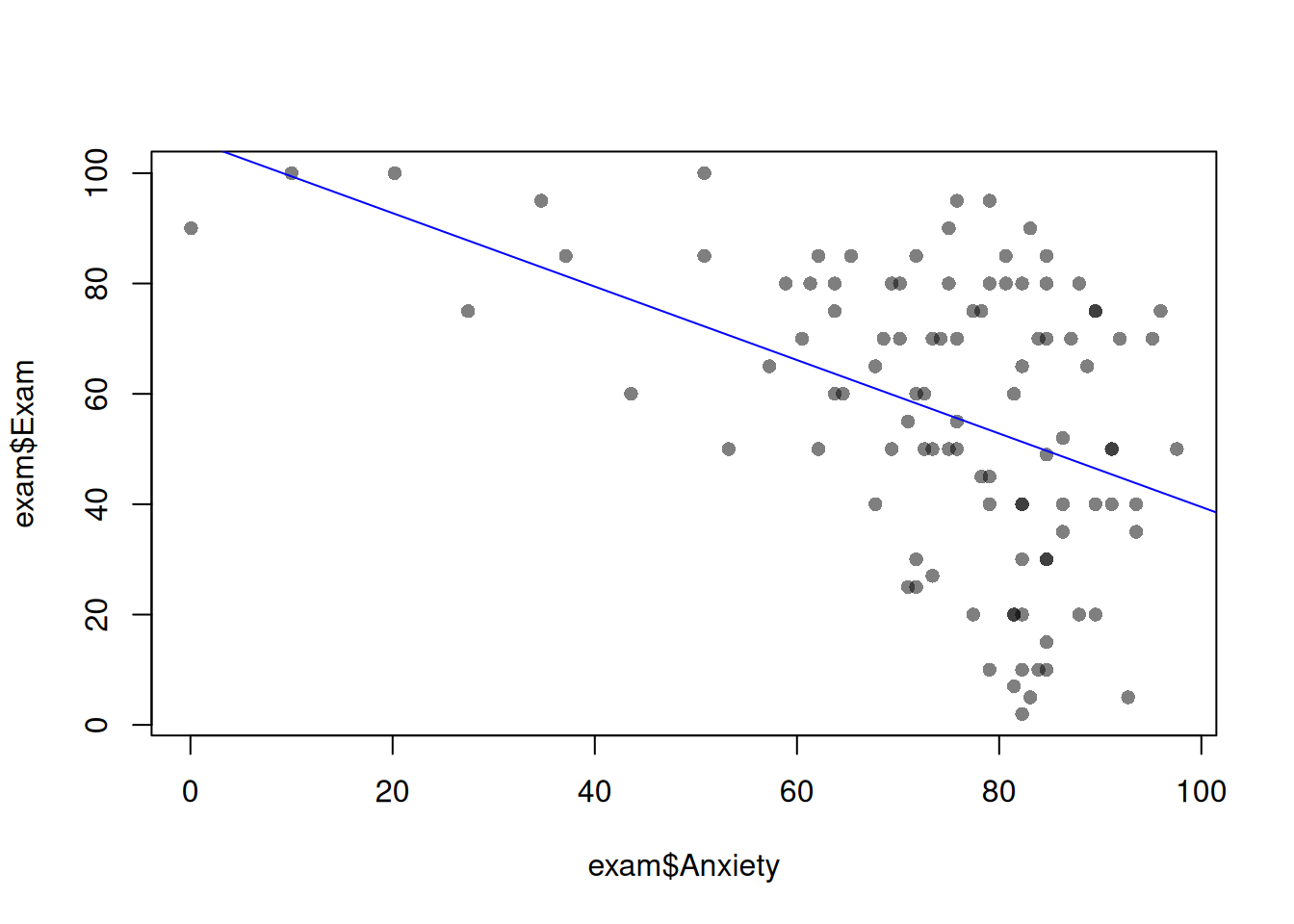 abline(lm(exam$Exam ~ exam$Anxiety), col="blue")