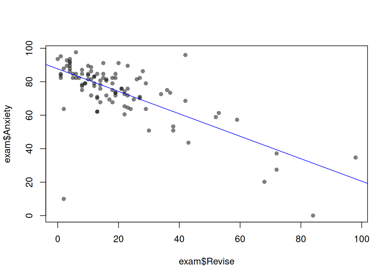abline(lm(exam$Anxiety ~ exam$Revise), col="blue")