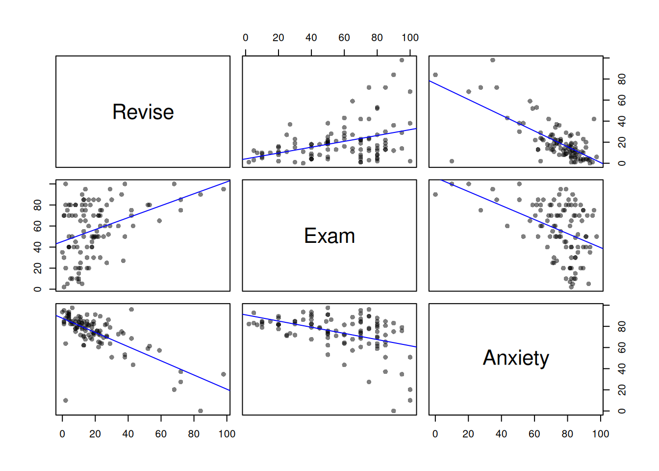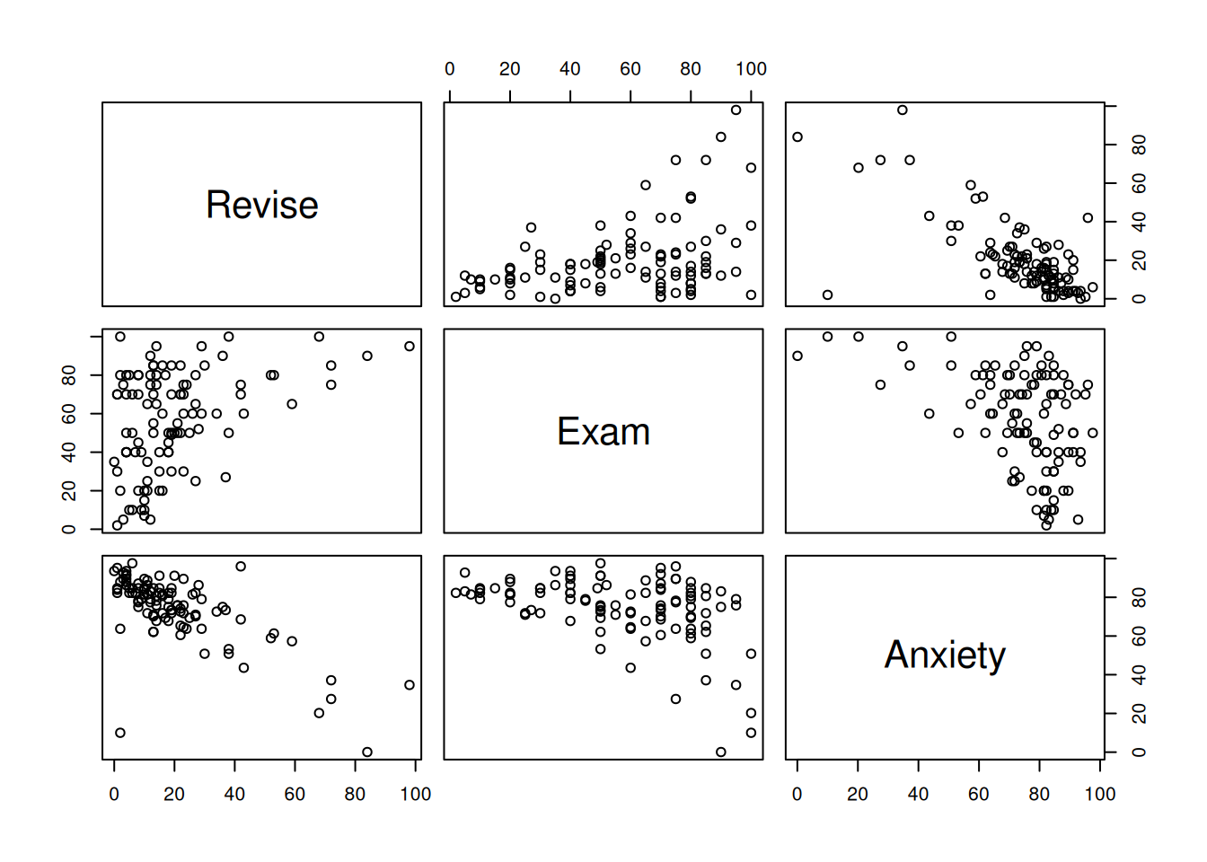 cor(exam[, c("Exam", "Anxiety", "Revise")]) Exam Anxiety Revise