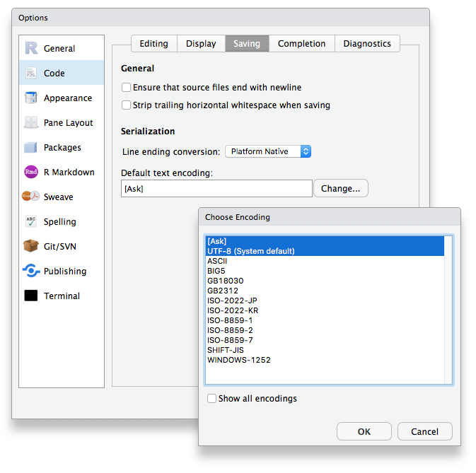 One final note for Windows users: Make sure to select UTF-8 as the default encoding for scripts (macOS and Linux already use this encoding by default). Open the RStudio preferences, navigate to “Code” – “Saving”, and select UTF-8 in the field “Default text encoding” (by clicking on “Change…”):