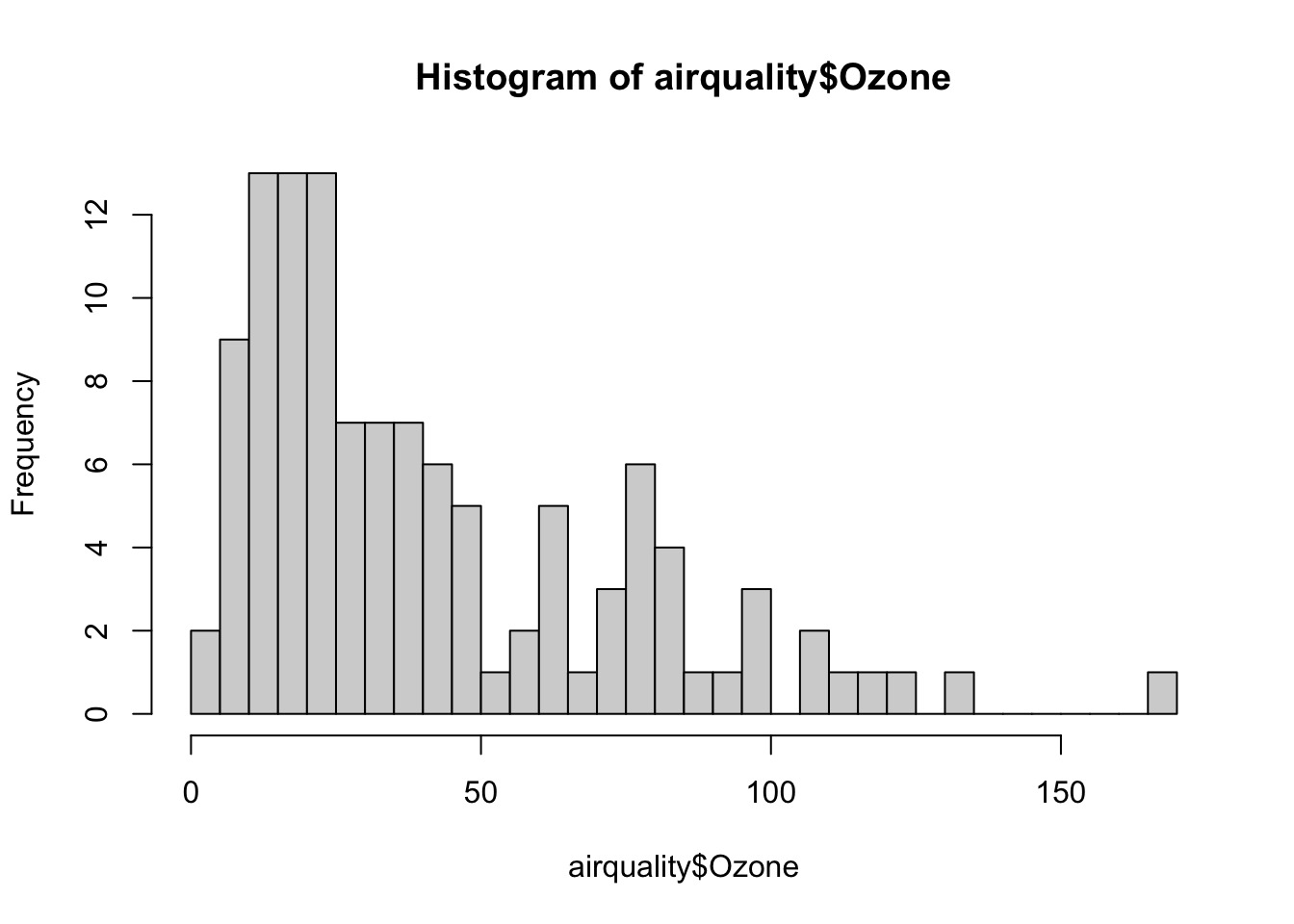 hist(airquality$Ozone, breaks=30)