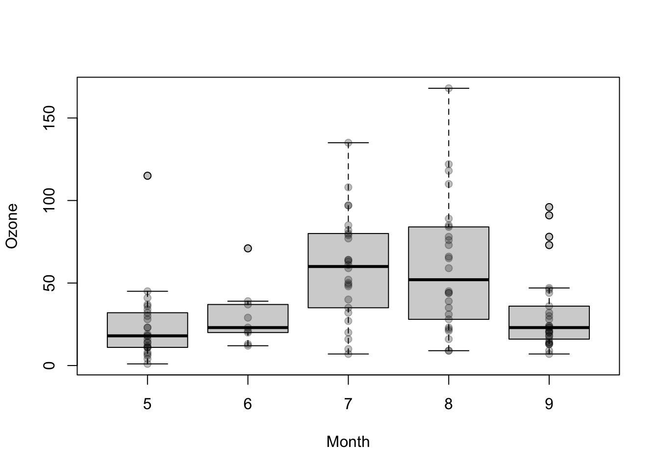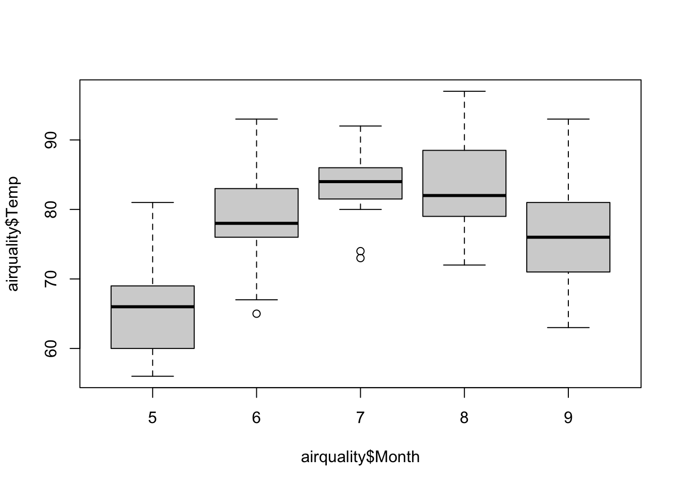 The following example creates boxplots for airquality$Temp separately for all levels of airquality$Month: