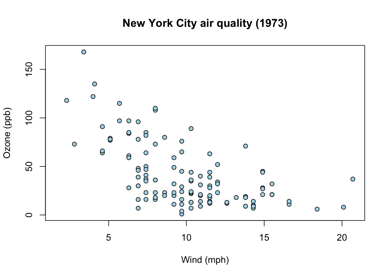 plot( airquality$Wind, airquality$Ozone,xlab="Wind (mph)", # x-axis labelylab="Ozone (ppb)", # y-axis labelmain="New York City air quality (1973)", # titlepch=21, # circle with borderbg="lightblue"# background color)