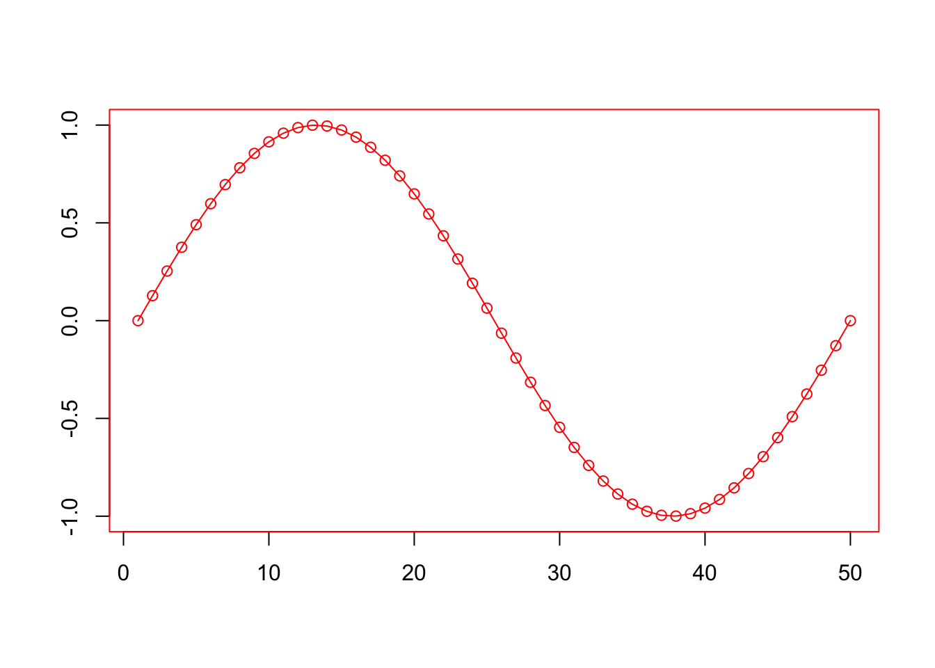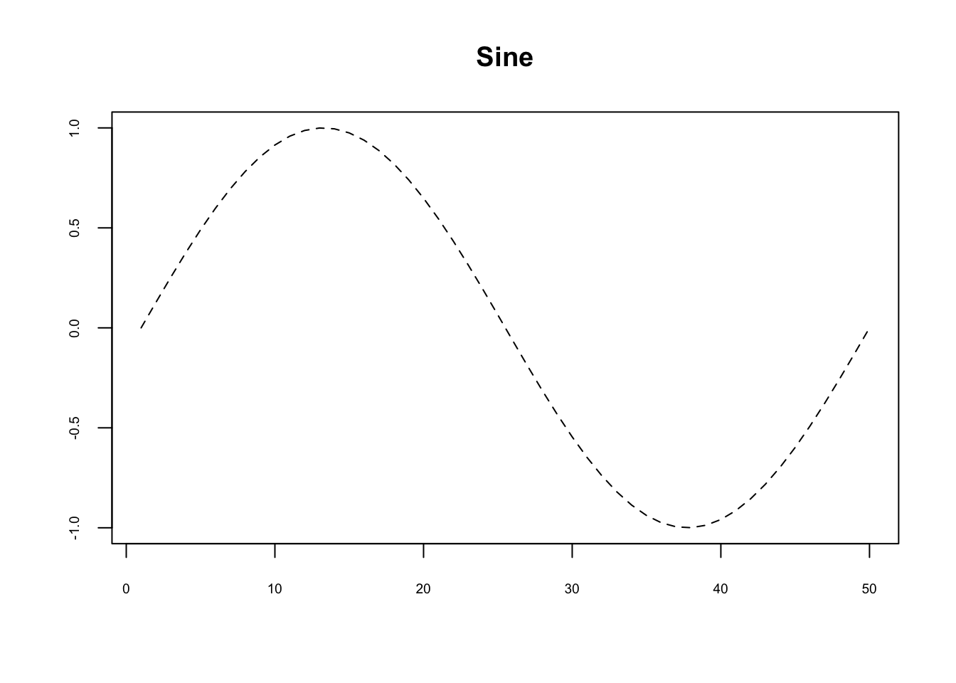 plot(sin(seq(0, 2*pi, length.out=50)),type="l",xlab="",ylab="",cex.axis=0.6, # axis label sizelty=2, # line typemain="Sine")