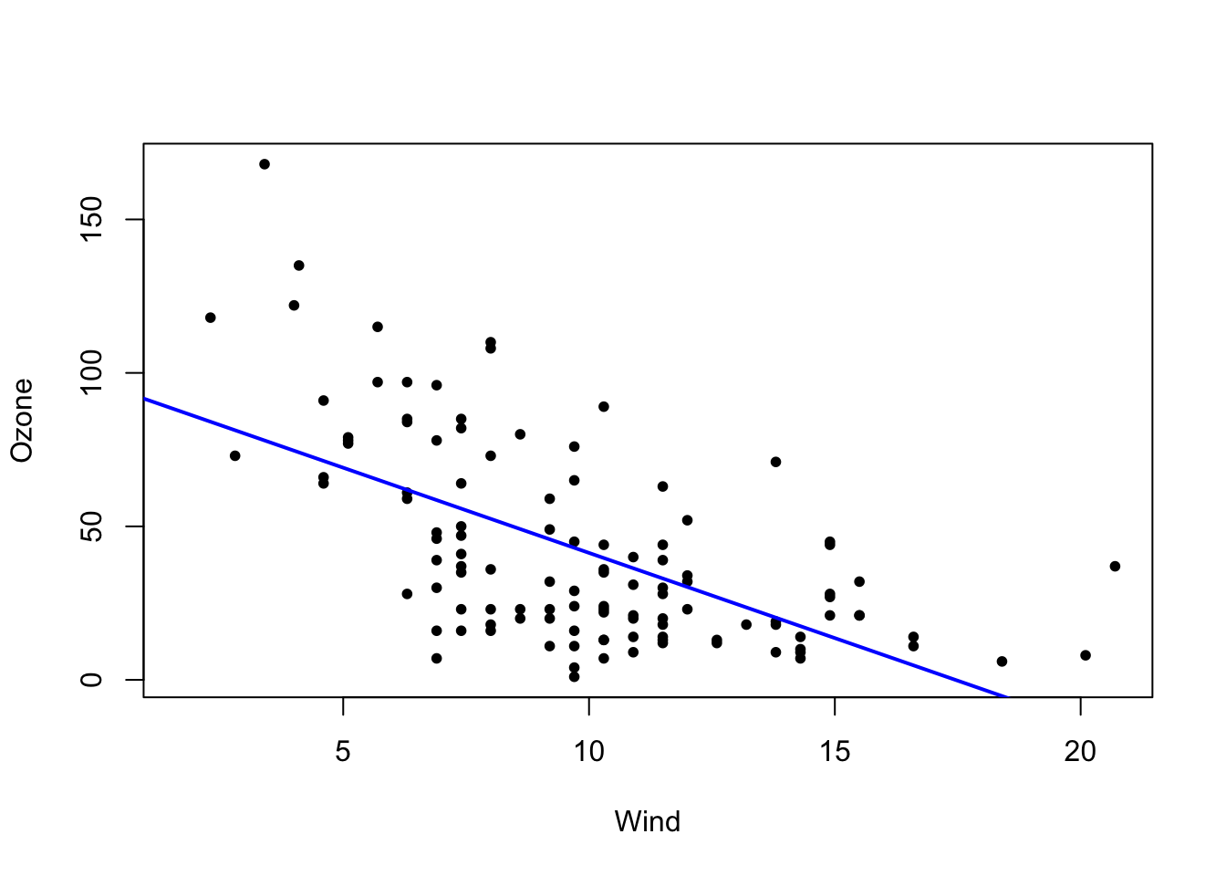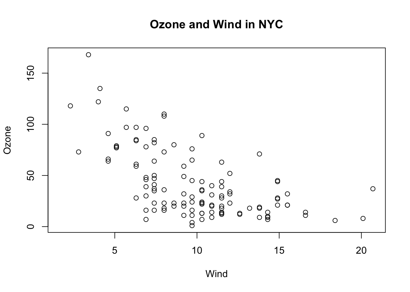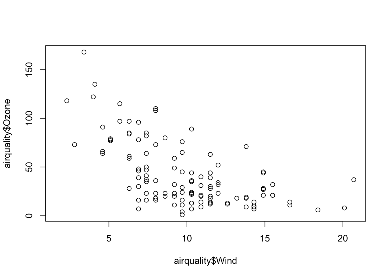 plot(airquality$Wind, airquality$Ozone)