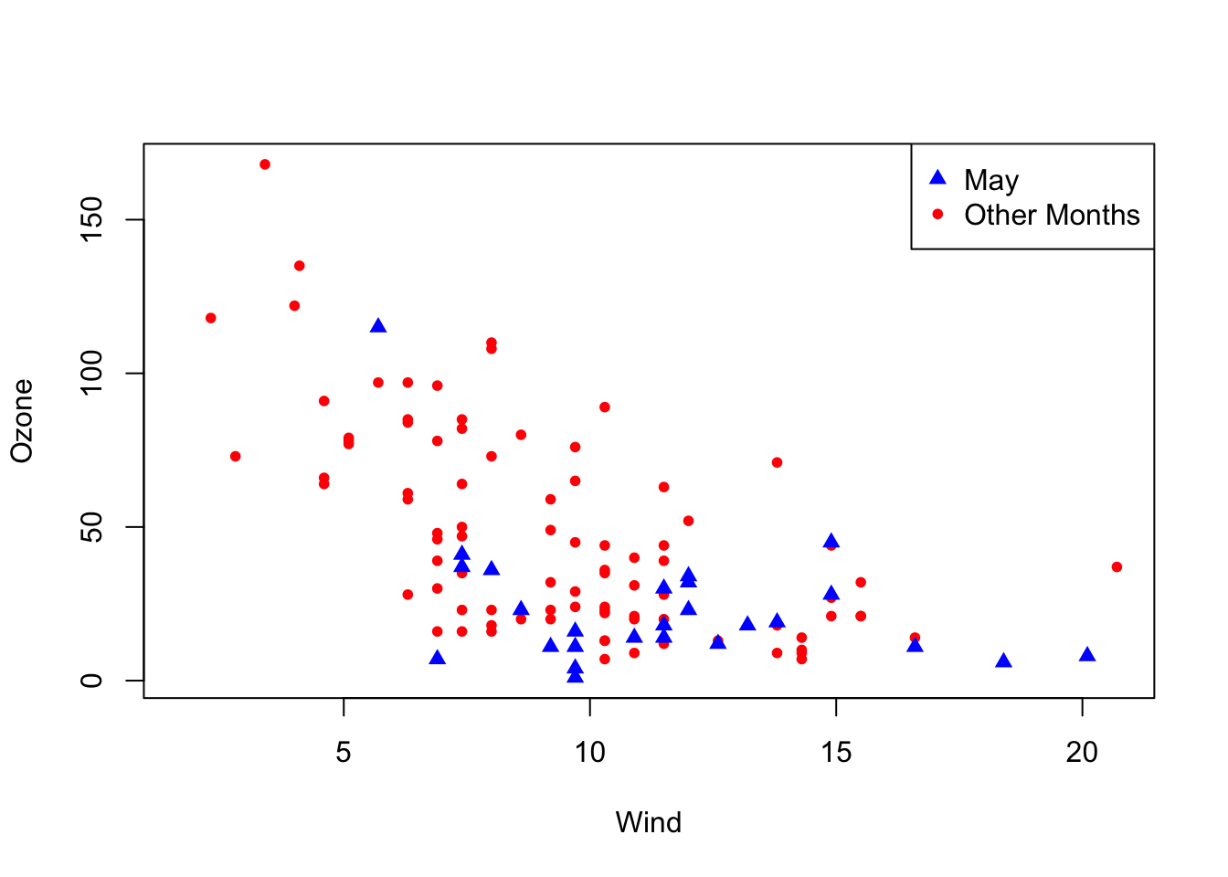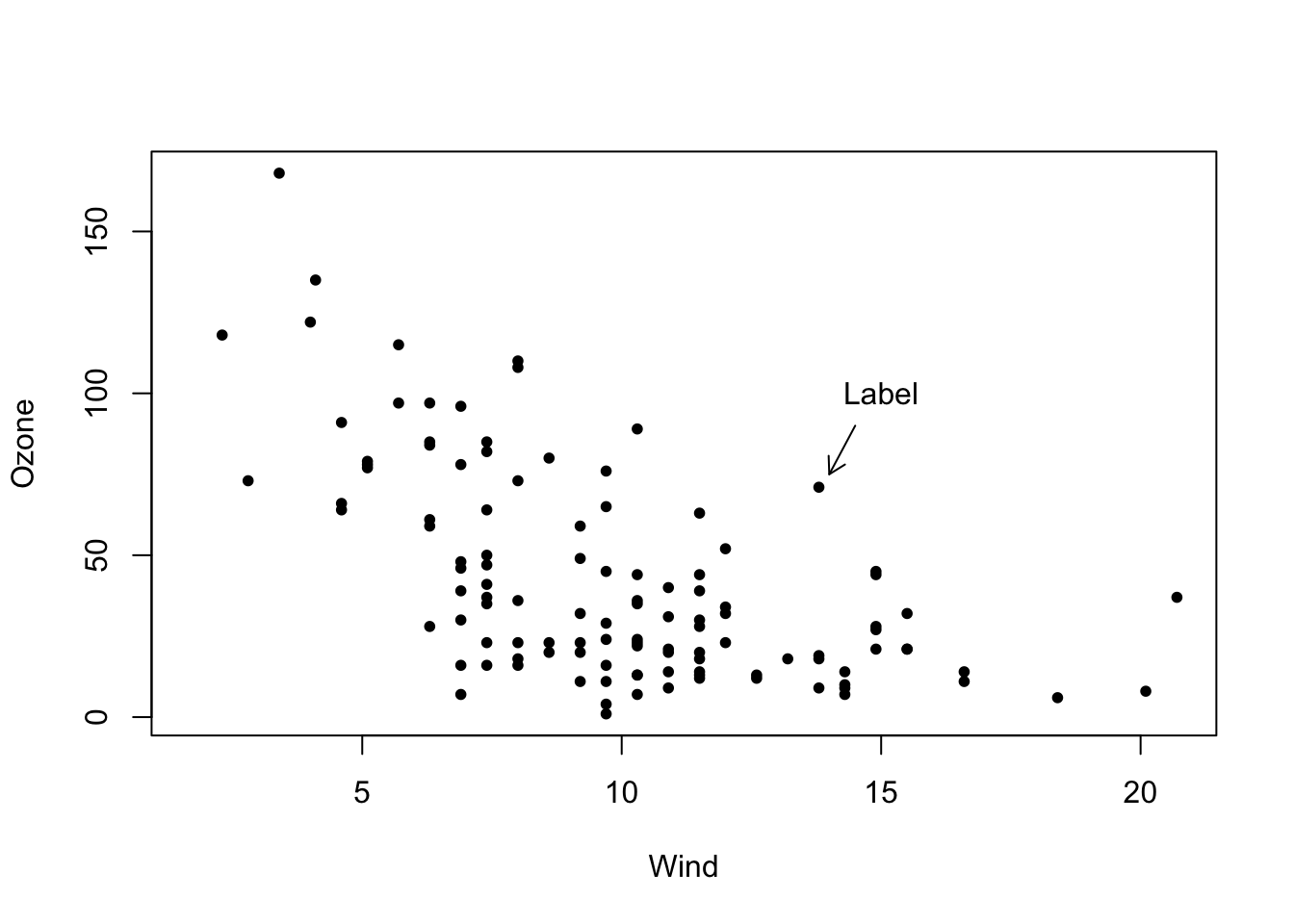 This example also uses the with() function. This function allows us to use column names from a data frame directly within the parentheses. For example, instead of airquality$Ozone, we can write Ozone. This means that the first line of the example is equivalent to plot(airquality$Wind, airquality$Ozone). However, note how the default axis labels depend on the x and y arguments!