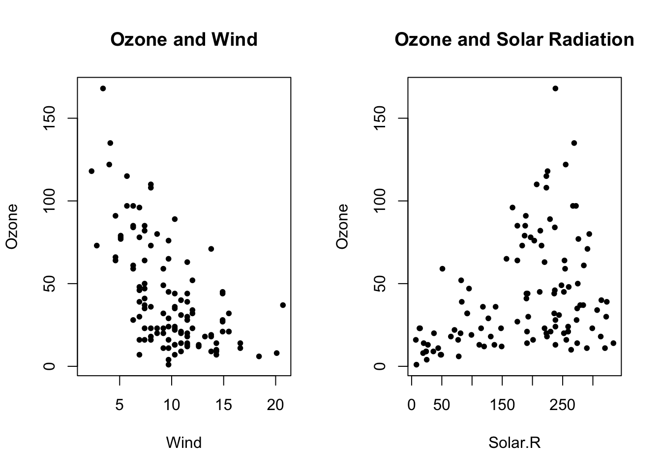 par(mfrow=c(1, 2)) # 1 row, 2 columnswith(airquality, plot(Wind, Ozone, main="Ozone and Wind", pch=20)) # plot 1with(airquality, plot(Solar.R, Ozone, main="Ozone and Solar Radiation", pch=20)) # plot 2