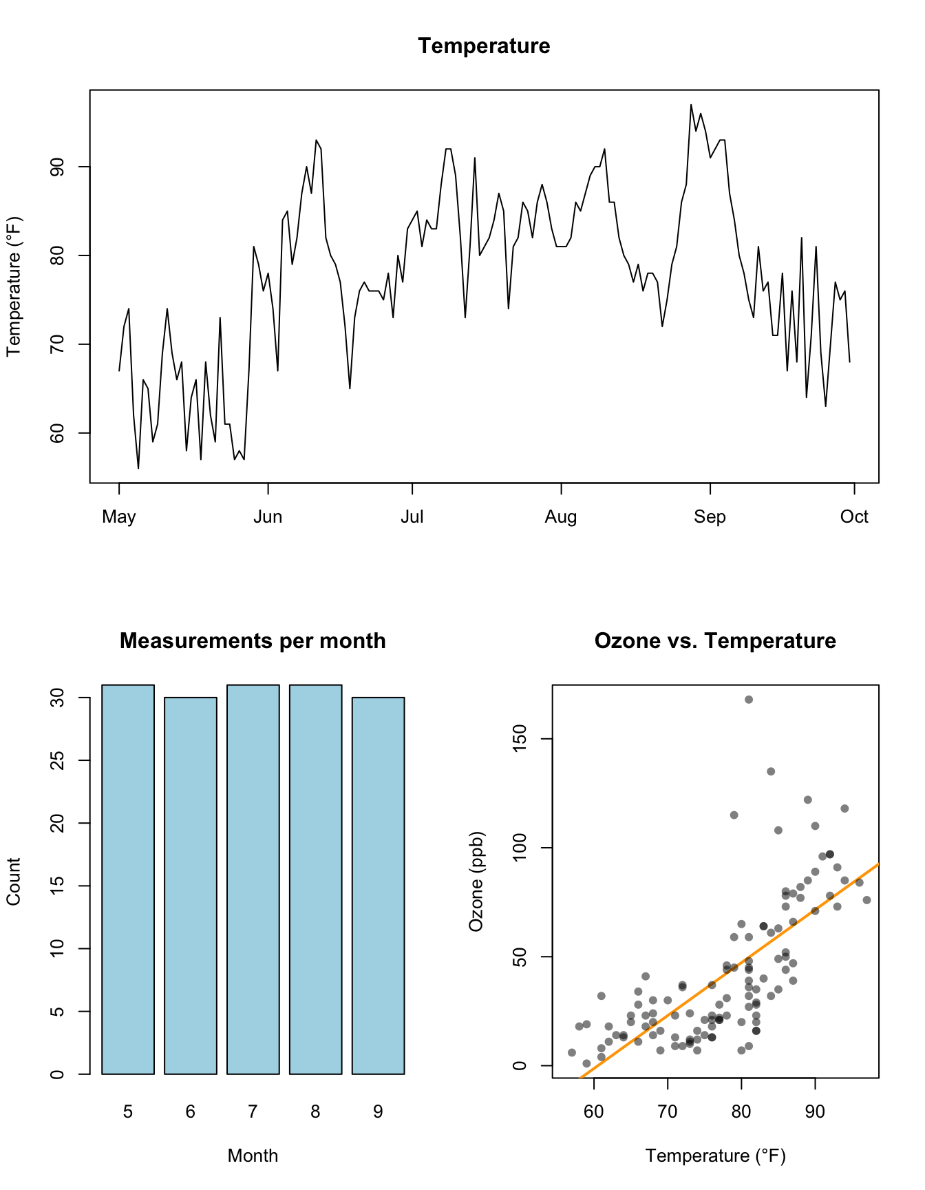 The following examples use the airquality dataset included in R (a brief description is available in ?airquality):