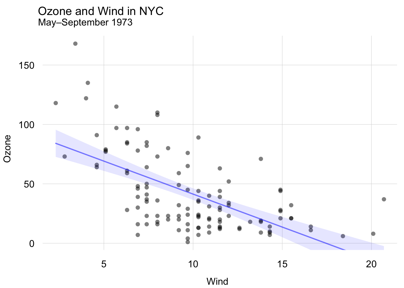library(tinyplot)tinytheme("minimal") # optionally set a themeplt( Ozone ~ Wind,data=airquality,alpha=0.5,main="Ozone and Wind in NYC",sub="May–September 1973")plt_add(type="lm", col="blue", lwd=2)