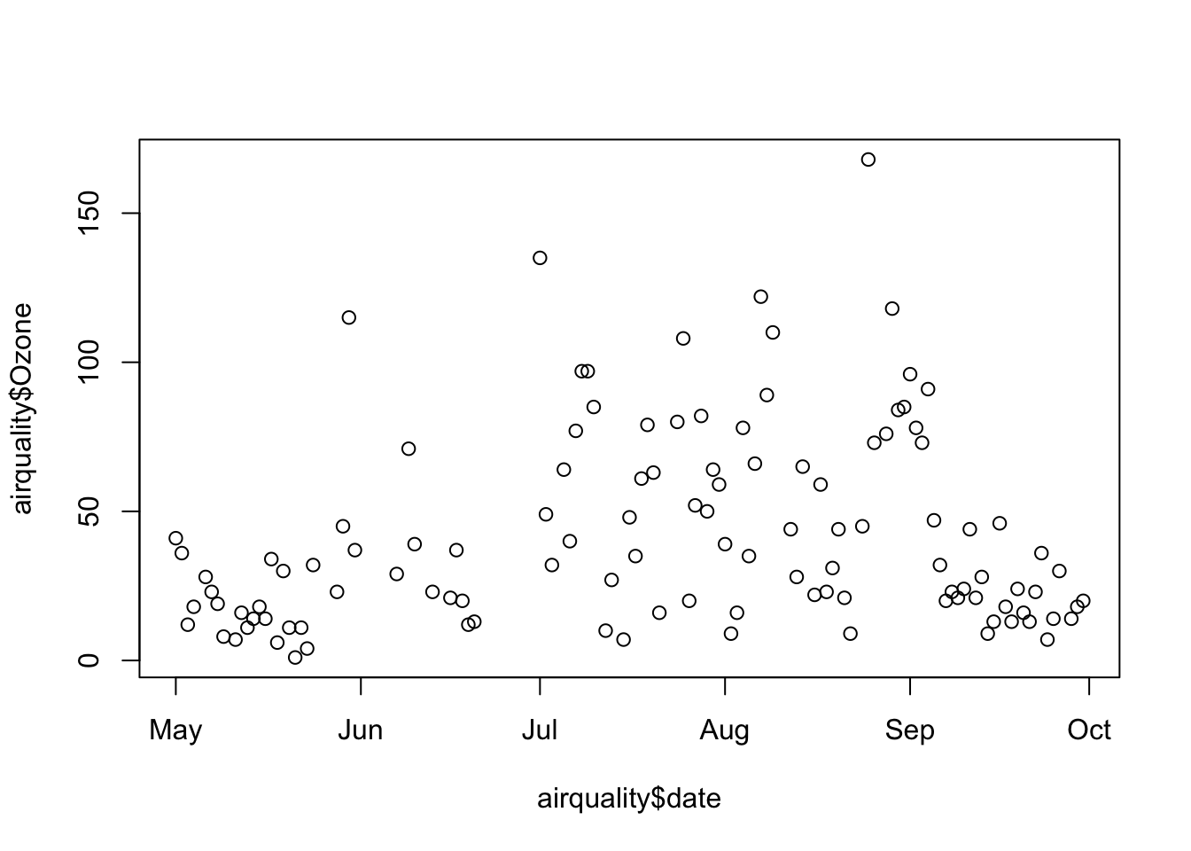plot(airquality$date, airquality$Ozone)